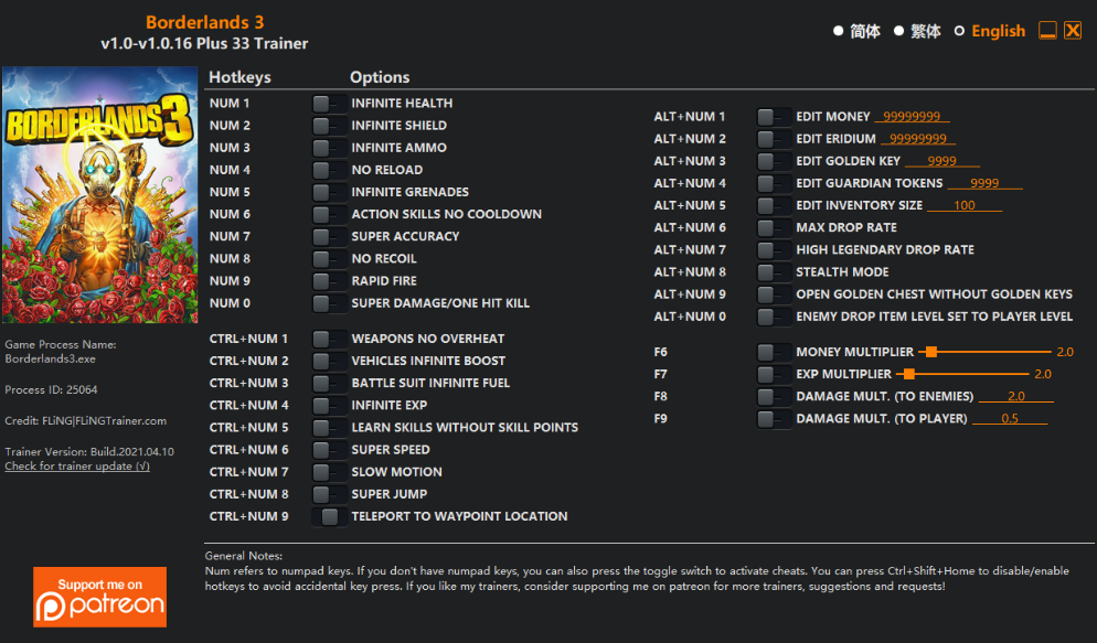 - "Edit Money", "Edit Eridium", and "Edit Golden Key": After activated, open inventory to see the values change.