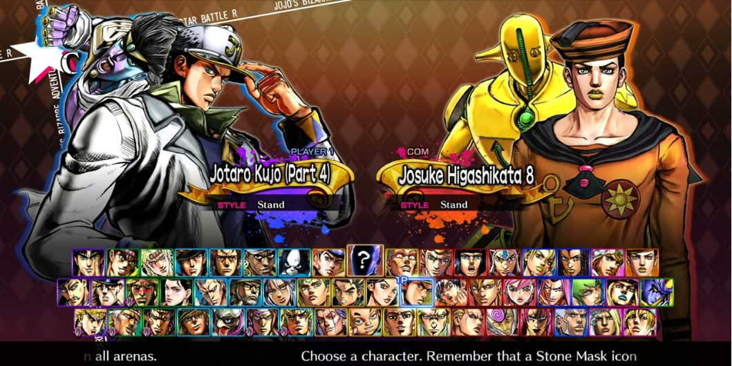 플레이어들은 각자의 독특한 플레이 스타일과 능력을 가진 다양한 캐릭터들 중에서 선택할 수 있다. 이 게임의 전투 시스템은 캐릭터들이 전투에서 그들을 돕기 위해 소환할 수 있는 초자연적 실체인 "스탠드" 능력을 중심으로 전개된다. 이 스탠드들은 서로 다른 능력과 강점을 가지고 있어 전투를 매우 전략적이고 치열하게 만듭니다.