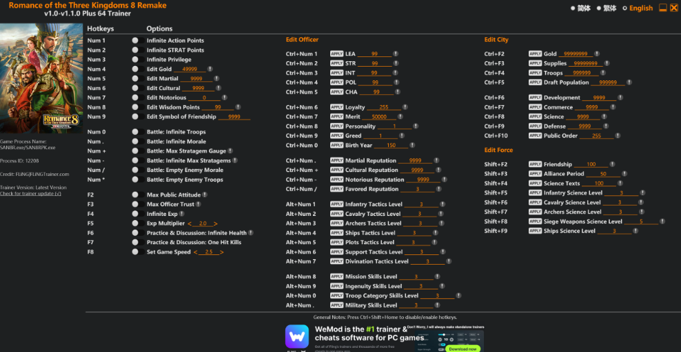 Options Num 1 – Infinite Action Points Num 2 – Infinite STRAT Points Num 3 – Infinite Privilege Num 4 – Edit Gold Num 5 – Edit Martial Num 6 – Edit Cultural Num 7 – Edit Notorious Num 8 – Edit Wisdom Points Num 9 – Edit Symbol of Friendsh